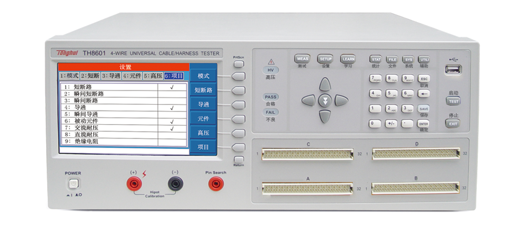 TH8601系列四端线材综合测试仪是专用于各种线缆,线束和排 线品质及连接可靠性检验的多功能,自动化的线材综合参数测试 系统。该系统提供可编程的恒流恒压源以及高压源,测试项目涵盖了导通,被动元件(电感,电阻,电容,二极管),交直流耐压,绝缘电阻各种高低压参数。本系统采用先进的LCR数字采样及高速长寿命通道切换技术,大大提高了测试精度,速度以及使用寿命。采用高低压分离技术,大大的提高绝缘电阻的测试性能。丰富的接口设计,本仪器还提供RS232, RS485, GPIB, USB, Handler等接口,便于用户运用于自动化检测和自动化产线。